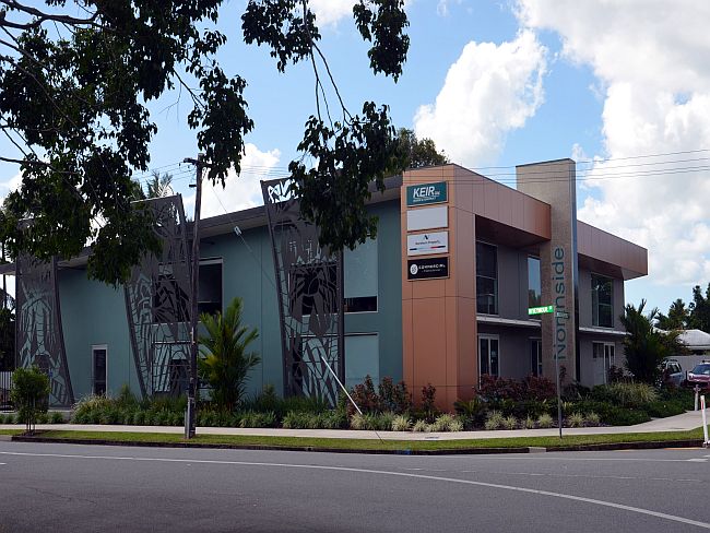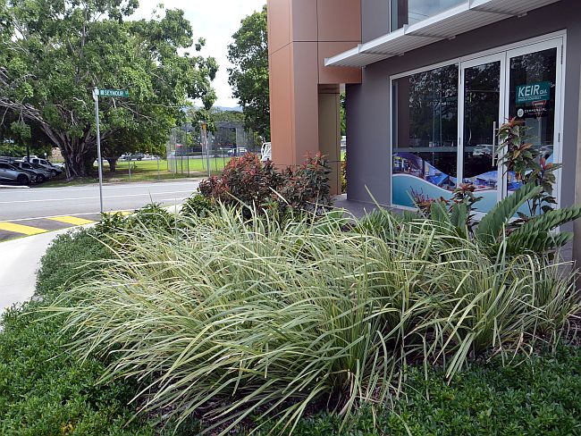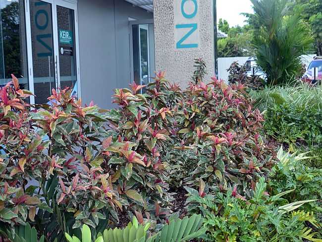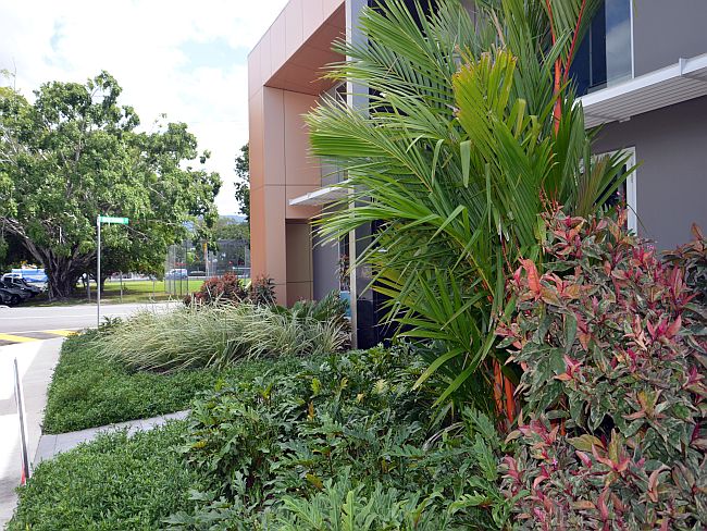 I loved working on this landscaping project for a new office complex in Cairns for one of my regular clients – Keir QLD https://keirqld.com.au/ .  As this was to be the new headquarters for their business, I was more adventurous with the landscaping design than on a traditional commercial scheme. The colours and textures of the plants were carefully coordinated with the colour-scheme and finishes of the building. The final effect of the planting design gives a lush, layered and textured garden.  I had to select plants which would be easy to maintain but always look effective.  Although the gardens are quite narrow the landscaping still gives the effect of a dense tropical border around the building.  Even the traffic island in front of the building has been replanted with baby Gardenias and Ficus ‘Green Island’. This softens the effect of being so close to the road intersection with a reasonably narrow footpath.