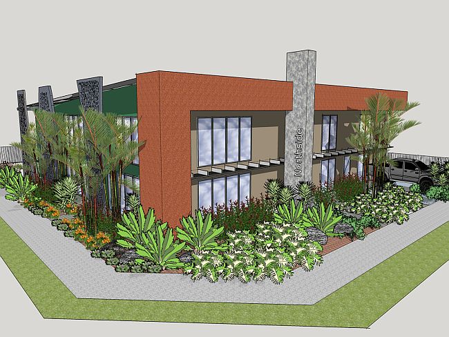 The building plans were drawn by Max Slade Designs.  The combination of working with clients and a design team who you know well often produces great results and I used this as an opportunity to design the landscape plans in 3D using Sketchup and then converting to AutoCAD https://www.autodesk.com.au/products/autocad/overview. Until recently  I’ve used a combination of the CAD drawings and hand-drawn sketches but the 3D images make life so much simpler. In this way we were all more easily able to coordinate colours and finishes. The result has been  that the building and landscape elements such as the massive cut-out aluminium blades and dramatic tropical screen plants work perfectly together.