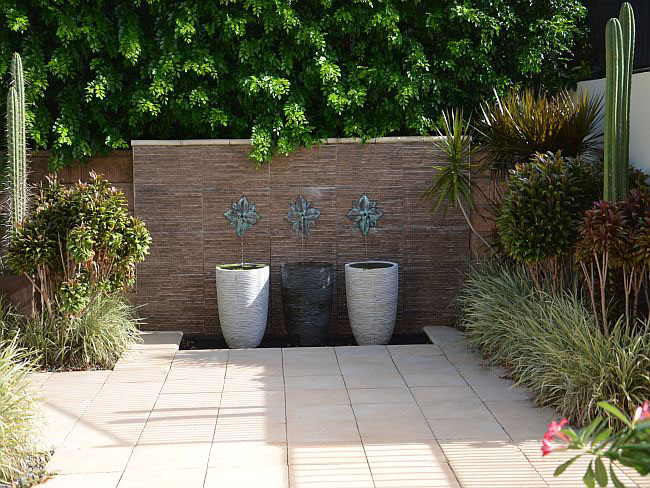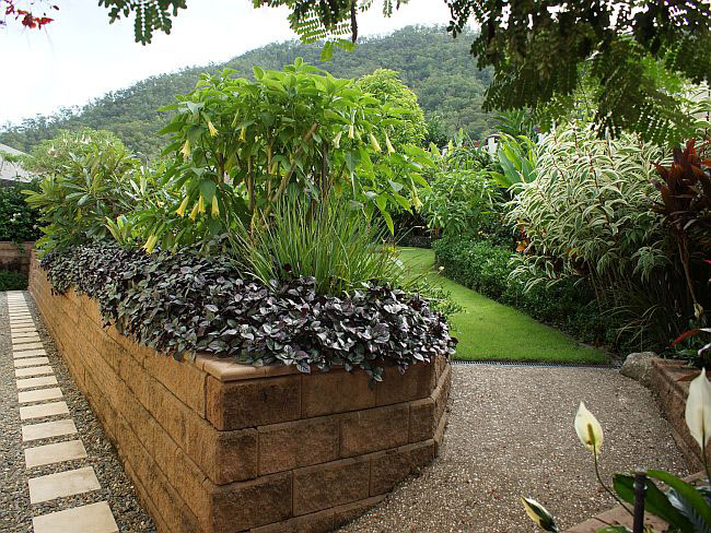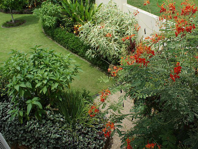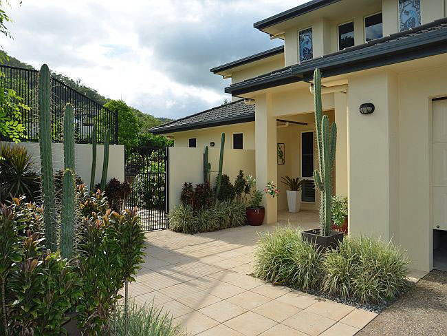 This landscape design appears deceptively simple – each courtyard which is individually themed leads one on a journey through to a new area. Dense layers of planting provide contrast in colour, texture and privacy. There is always something in flower. This is a small oasis in the busy subdivision of the Cairns foothills. The access to supportive and professional landscape contractors (Terry McGuire and team) made this garden construction a pleasure for everyone and I enjoy visiting this garden and its delightful owners to check on progress when I am in the area.