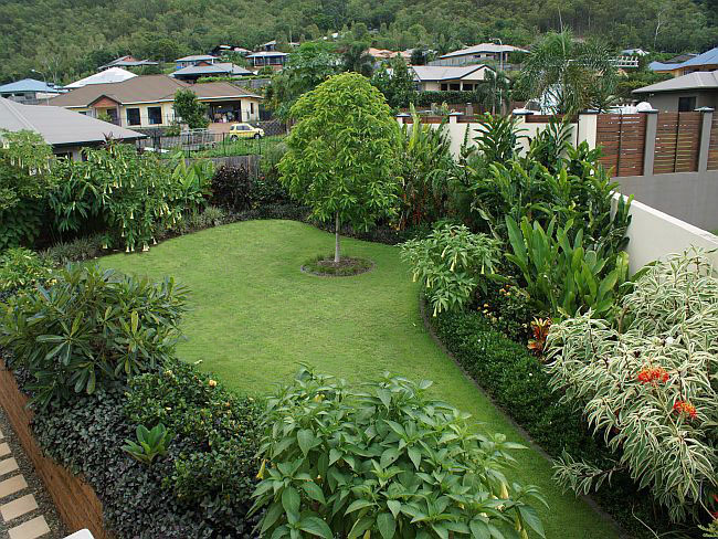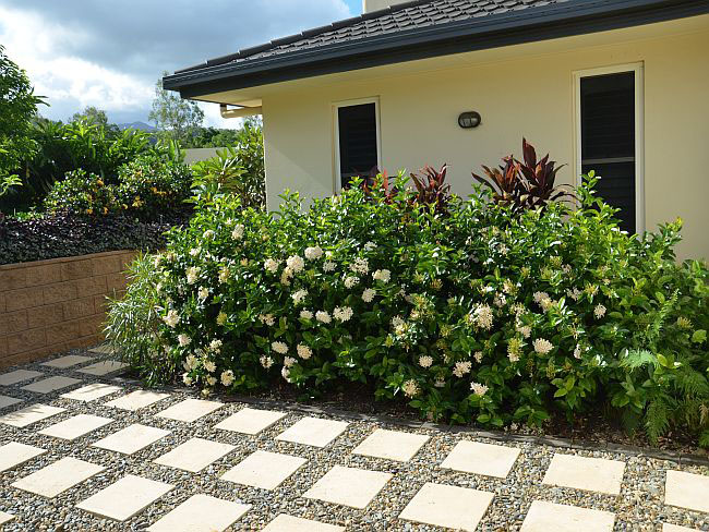 Located on the Southern side of Cairns, this garden was designed using tropical plants to provide reliable year-round colour and texture and create privacy within the landscape. The entry courtyard contains a small pond with a permanently running water feature and an attractive black aluminium gate provides glimpse though another paved and gravel courtyard onto an upper lawn level where Heliconias, Frangipanis, Costus and baby Gardenias blend with the owner’s collection of Moon Flowers and Angel’s Trumpets. Paths lead from this lawn to the pool area behind the house and the garden is always full of birds and lizards.